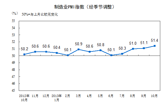 2013年10月,中国制造业采购经理指数(PMI)为51.4%,比上月上升0.3个百分点,连续4个月回升,为18个月以来的新高,表明我国制造业经济稳中向好。